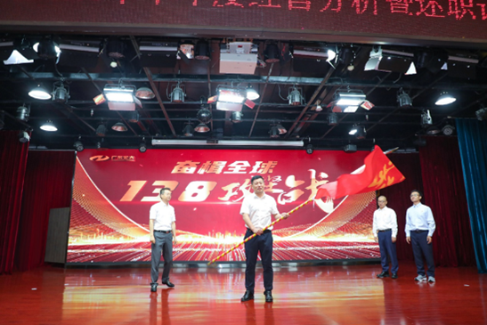 会议隆重举行了“奋楫全球·138攻坚战”誓师仪式。郑炳旭董事长代表董事会笃定年度目标,号召全体宏大人要有“乱云飞渡仍从容”的定力,要有“敢教日月换新天”的豪情,要有“咬定青山不放松”的韧劲,要有“直挂云帆济沧海”的魄力,迎难而上,开启新的篇章,赢取更大的胜利。在庄严的授旗仪式上,郑炳旭董事长将“奋楫全球·138攻坚战”战旗,郑重地授予公司轮值总经理团队。轮值总经理团队带领全体骨干人员共同承诺,坚决完成董事会下达的全部指标任务。