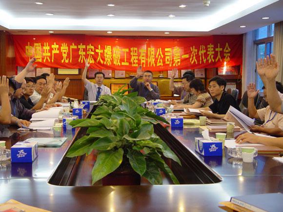 2006年5月29日,中共广东宏大爆破工程有限公司第一次代表大会圆满召开。本次大会的主要议程是:一、听取和审议郑炳旭同志所作的公司临时党委会工作报告;二、通过《中共广东宏大爆破工程有限公司第一次代表大会选举办法》;三、按照党章的规定,选举产生中共广东宏大爆破工程有限公司第一届党委会、第一届纪委会。