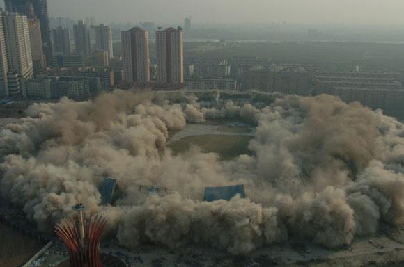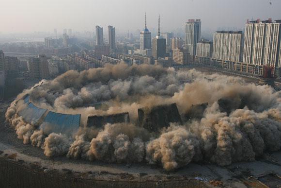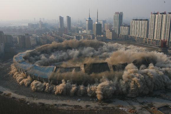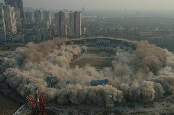 2月12日下午3点,我司成功环保爆破拆除沈阳五里河体育馆,五里河体育场在一声巨响中化为乌有,由于之前的爆破点是围绕整个体育场埋设,所以整个体育场的爆破在6.6秒钟之内结束。 本次爆破拆除建筑物,不论是单体面积还是一次爆破面积都是世界之最,也是世界上首次超大规模的环保拆除爆破,是名符其实的“中国第一爆”。