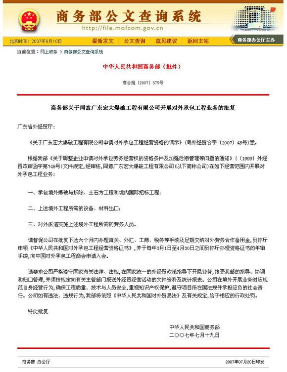 根据中华人民共和国商务部“商合批(2007)575号”文的批示,同意广东宏大爆破工程有限公司开展对外承包工程业务:1、承包境外爆破与拆除、土石方工程和境内国际招标工程;2、境外工程所需的设备、材料出口;3、对外派驻实施境外工程所需的劳务人员。