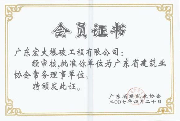 2007年12月6日,我司参加了广东省建筑业协会第三届理事会二次会议,我司被批准为广东省建筑业协会第三届常务理事单位,总经理郑炳旭任该届常务理事。该协会是广东省各地区、各部门从事土木工程、建筑工程、线路管道设备安装工程、装修工程等建筑业企业、社会团体自愿参加组成的全省性行业组织。业务范围包括向政府及有关部门反映广大建筑施工企业的要求和愿望,为政府部门制定行业管理的政策、法规提供参考依据等。