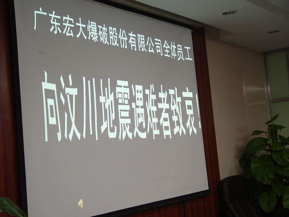 2008年5月19日下午2时20分,广东宏大爆破股份有限公司总部员工带着沉重的心情来到会议室,会议室的投影幕上播放着四川汶川大地震的现场图片,一幅幅令人痛心的照片印入大家的眼帘。此刻,会议室空气凝重,一片寂静,大家默默地看着,感受着灾区人民的感受,担忧着全国人民的担忧。2时28分,向四川汶川地震遇难者默哀正式开始,随着哀乐奏起,全体员工低头默哀。就是这三分钟,我们真的什么都不想做,只想哭泣,也正是这三分钟,寄托了我们对灾区遇难同胞的无限哀思。