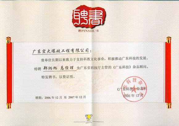 近日,由广东省科技厅主管的《广东科技》杂志聘请我司郑炳旭总经理为该刊顾问。聘书中高度评价我司长期以来致力于支持科教文化事业,积极推动广东科技的发展。郑总荣聘该刊顾问,将通过该杂志的舆论力量,不断增强与社会各界的信息与经验交流,树立我司科技创新型企业新形象。