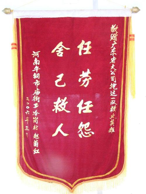 我司在河南省舞钢市的广东宏大舞钢经山寺采矿工程项目部,于三月二十日中午,接受当地村民赠送的‘舍己救人、任劳任怨’锦旗一面,该锦旗是当地村民为了表彰我司田荫堂、向华朝等同志在二月二十五日晚带领、组织项目部职工为当地村民抢险救火的舍身行为。