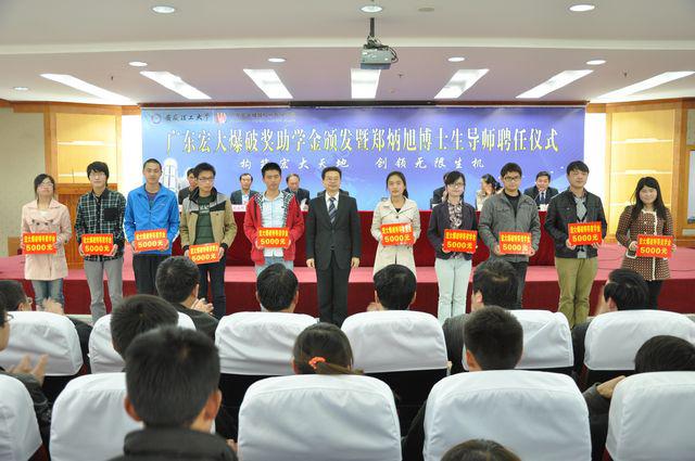 2013年4月11日下午, 安徽理工大学宏大爆破奖助学金颁发暨郑炳旭博士生导师聘任仪式在安徽理工大学(以下简称安理工)新教学楼九楼报告厅隆重举行。安理工校长颜事龙、广东宏大爆破股份有限公司(以下简称宏大爆破)董事长郑炳旭、校领导叶醒狮、王其东、宏大爆破人力资源总监符益群以及学校相关师生共计400余人参加了本次表彰大会。共有115名(本科生、硕士生)学生获得本次奖助学金并获现场颁奖。