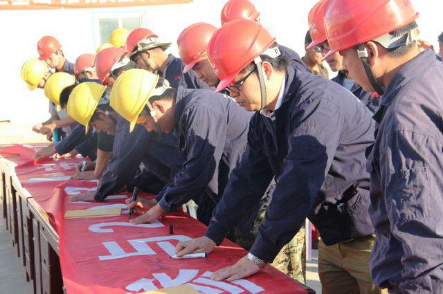 随后,项目安全环保部副部长关山跃带领300余名项目部干部职工,面对国旗,举起紧握的右拳,集体庄严宣誓。铮铮誓言,表达了全体干部职工恪尽职守,强化安全基础、推动安全发展,为公司无私奉献的的爱岗之心。随后,大家郑重的在印有“强化安全基础、推动安全发展”的条幅上签上了自己的名字。