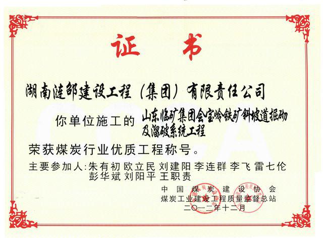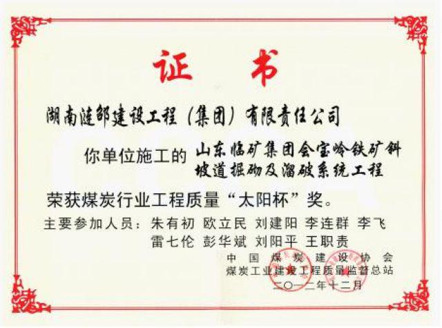 涟邵建工集团承建的山东临矿集团会宝岭铁矿斜坡道掘砌及溜破系统工程喜获煤炭行业“优质工程”称号,并获煤炭行业工程最高质量奖“太阳杯”奖。