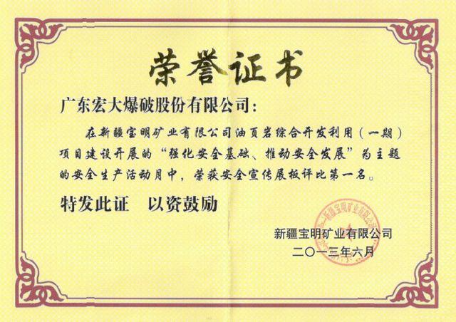 2013年6月,作为“安全生产月”系列活动,在公司和片区的支持和指导下,新疆宝明项目部荣获2013年新疆宝明矿业有限公司(以下简称:宝明矿业)“安全生产月“安全宣传展板评比第一名。