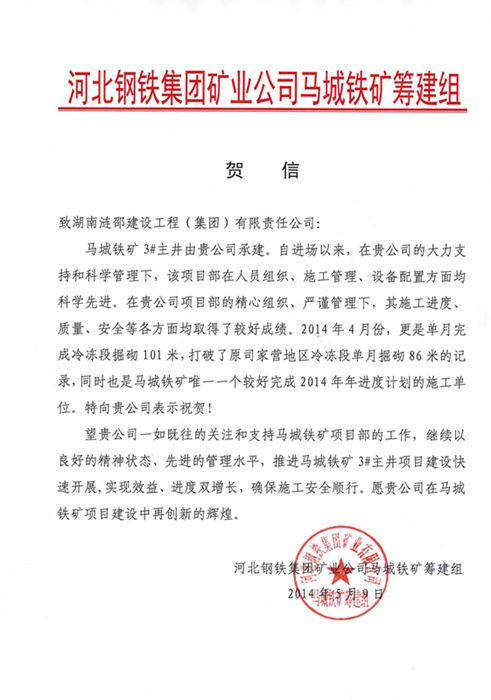 5月9日,河北钢铁集团矿业公司马城铁矿筹建组向广东宏大爆破股份有限公司控股公司:湖南涟邵建设工程(集团)有限责任公司(以下简称:涟邵建工)发来贺信,涟邵建工在承建马城铁矿3#主井施工中,进度、质量、安全均取得较好成绩,在4月份完成单月冷冻段掘砌101米,打破了业主方其他立井冷冻段单月掘砌86米的记录。