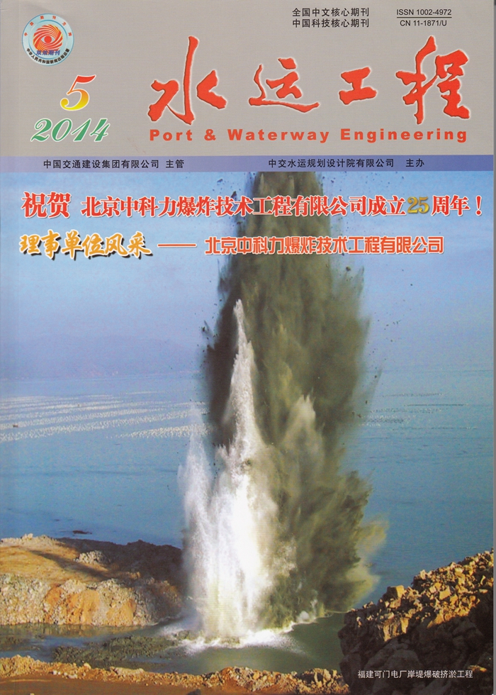 2014年第5期《水运工程》封面采用了广东宏大爆破股份有限公司控股子公司:北京中科力爆炸技术工程有限公司(以下简称:中科力)爆破现场照片。《水运工程》作为中国科技核心期刊之一,拥有对水运工程行业最具影响力的编委会,并被国内同行公认为在水运工程行业中有重大影响的权威性技术刊物。时值中科力成立二十五周年(1989—2014),能荣登其封面是对我公司的肯定与嘉许,并说明中科力在水运行业中拥有着极大影响力。