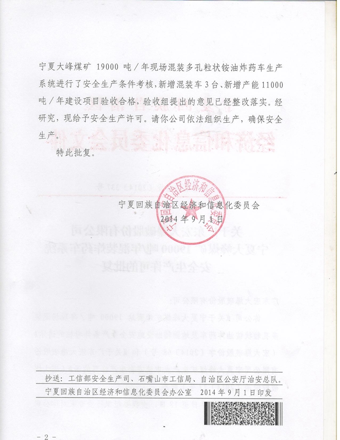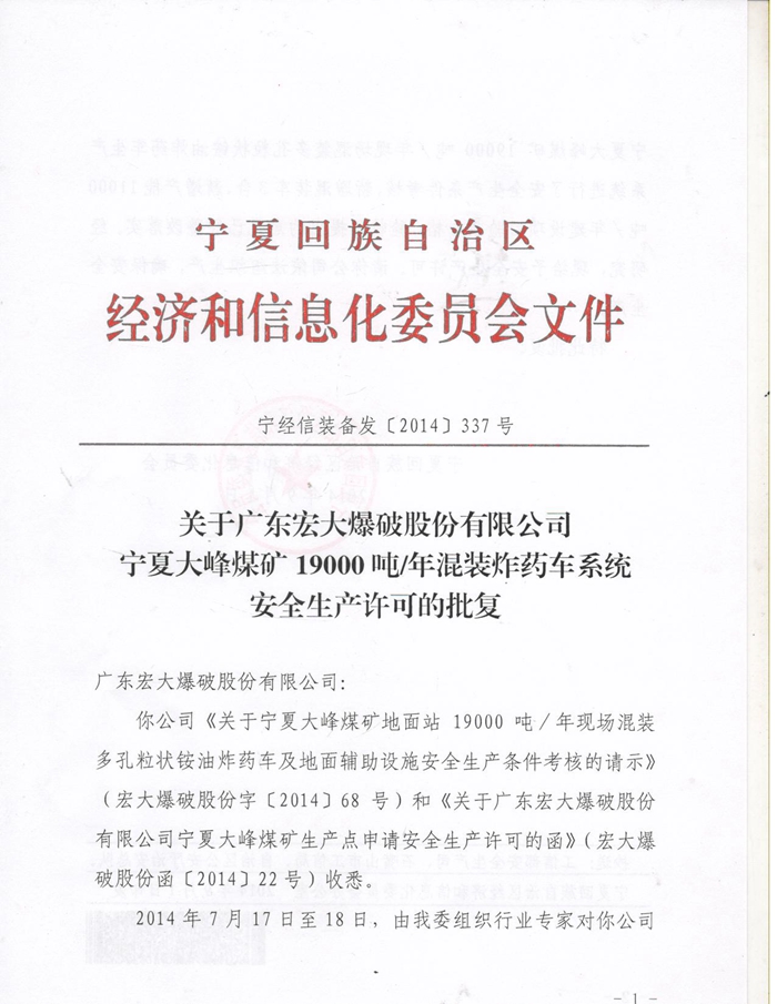 9月1日,广东宏大爆破股份有限公司收到宁夏回族自治区经济和信息化委员会印发的《关于广东宏大爆破股份有限公司宁夏大峰煤矿19000吨/年混装炸药车系统安全生产许可的批复》。批复文件内容显示:宁夏大峰煤矿19000吨/年现场混装多孔粒状铵油炸药车生产系统通过安全生产条件考核,新增混装车3台,新增产能11000吨/年,建设项目验收合格,验收组提出的问题已经整改落实,经研究,现给予安全生产许可。
