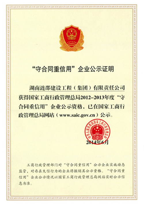近日,广东宏大爆破股份有限公司控股子公司:湖南涟邵建设工程(集团)有限公司(以下简称:涟邵建工)从娄底市工商行政管理局领回了,由国家工商行政管理总局颁发的2012-2013年度“守合同重信用”企业公示证明。至此,涟邵建工已经连续两次获此殊荣。