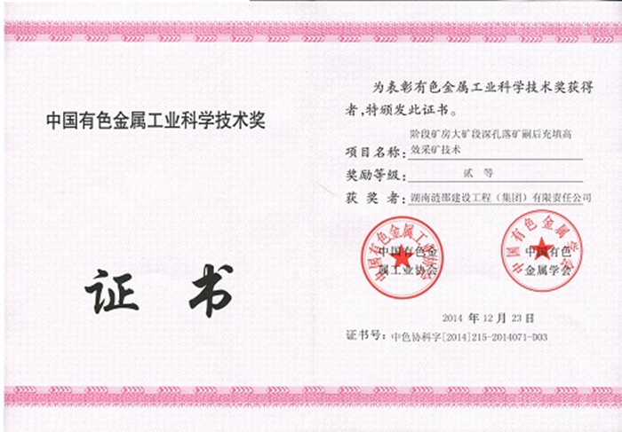 近日,广东宏大爆破股份有限公司下属子公司:湖南涟邵建设工程(集团)有限责任公司(以下简称:涟邵建工)收到中国有色金属工业协会、中国有色金属学会颁发的中国有色金属工业科学技术奖证书,涟邵建工主导完成的“阶段矿房大矿段深孔落矿嗣后充填高效采矿技术”科技成果荣获二等奖。