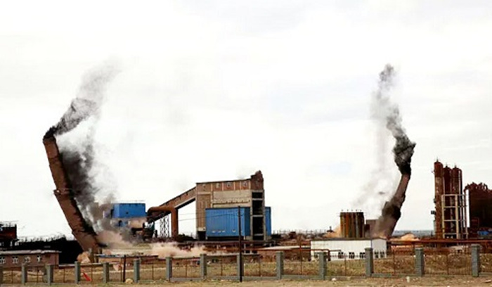 6月10日下午7时整,随着指挥员在对讲机里下达“5、4、3、2、1、起爆”的起爆指令,在新疆昌吉州阜康市晋泰实业有限公司晋泰焦化厂区内,广东宏大爆破股份有限公司新疆宝明项目部成功爆破拆除了两根高耗能、高污染,高度为60米的烟囱。这是宏大爆破继2014年12月7日成功爆破拆除阜康市众和热电厂150米烟囱项目后,与阜康市人民政府在“蓝天行动”计划中再一次成功合作。阜康市市长、环保部西北督导组、阜康市相关机构及企业代表现场观摩此次爆破,阜康市市长张晓文对此次爆破给予高度评价。