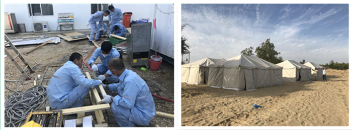 由于疫情影响,人员调动和物资采购极为困难,项目部发动员工做好营区场平,动手改装集装箱做厨房、搭建帐篷,亲手制作餐桌等家具。